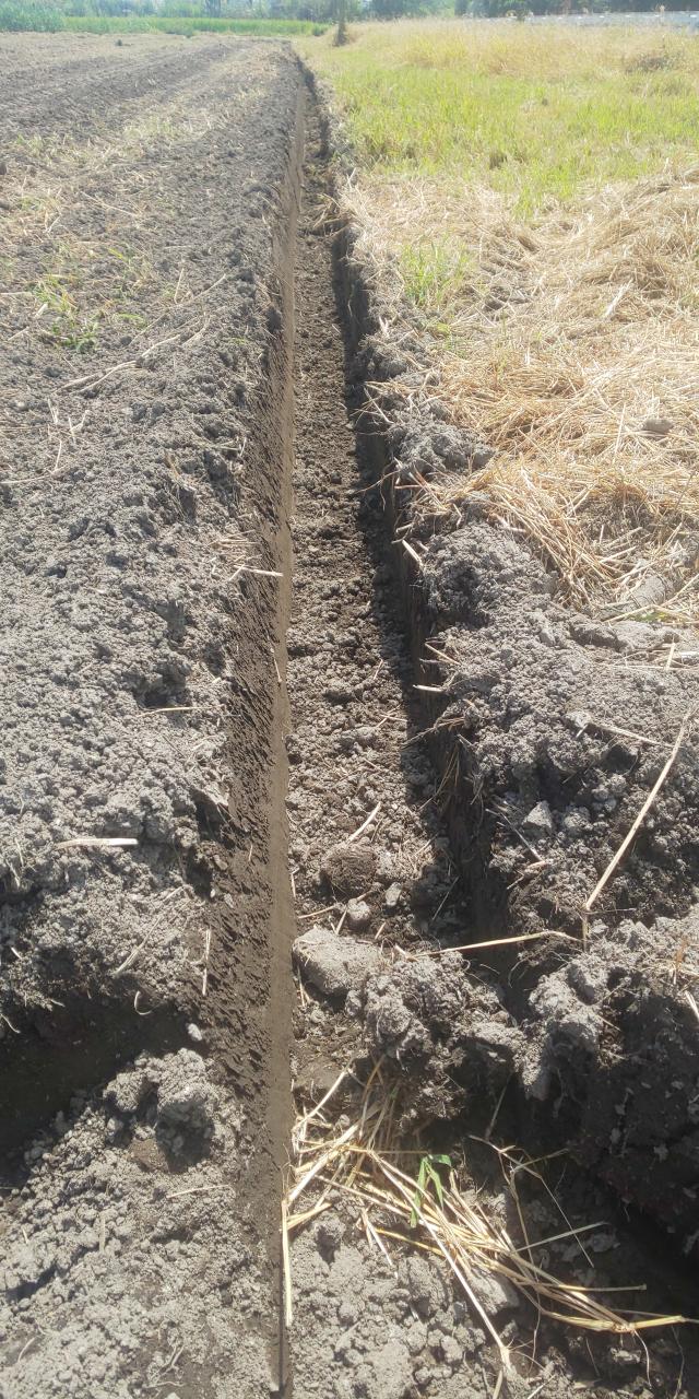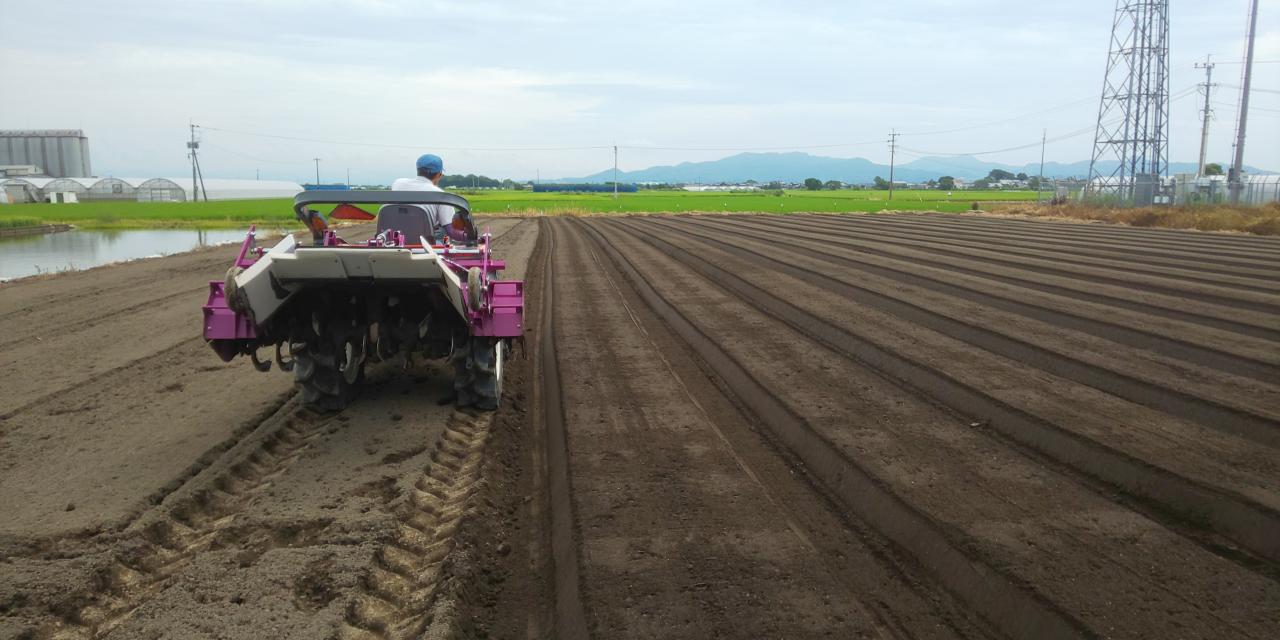 加工用ほうれん草のほ場準備を進めています。排水用の明渠をほ場の周りに掘っていきます。